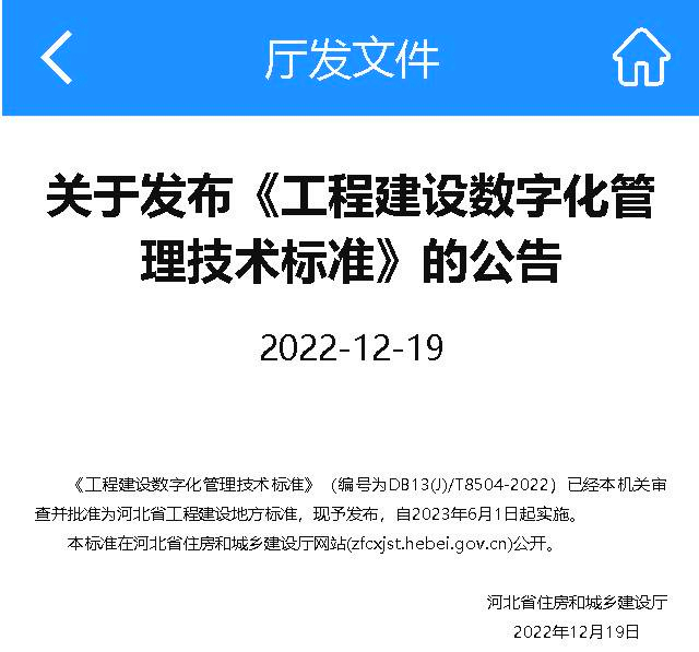 2022年12月19日,由河北省建筑科學(xué)研究院有限公司、河北省住房和城鄉(xiāng)建設(shè)廳信息宣傳與檔案中心和北方工程設(shè)計(jì)研究院有限公司共同主編的《工程建設(shè)數(shù)字化管理技術(shù)標(biāo)準(zhǔn)》(編號(hào)為DB13(J)/T8504-2022)已經(jīng)河北省住房和城鄉(xiāng)建設(shè)廳審查并批準(zhǔn)為河北省工程建設(shè)地方標(biāo)準(zhǔn),自2023年6月1日起實(shí)施。