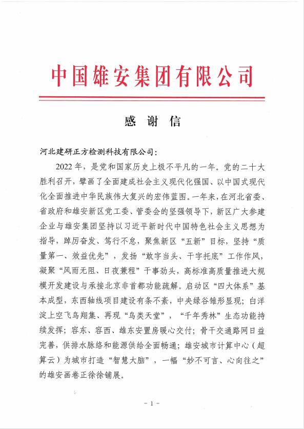 近日,建研正方公司收到雄安集團(tuán)發(fā)來的感謝信,對(duì)建研正方公司2022年為雄安新區(qū)發(fā)展建設(shè)所做出貢獻(xiàn)表示感謝。