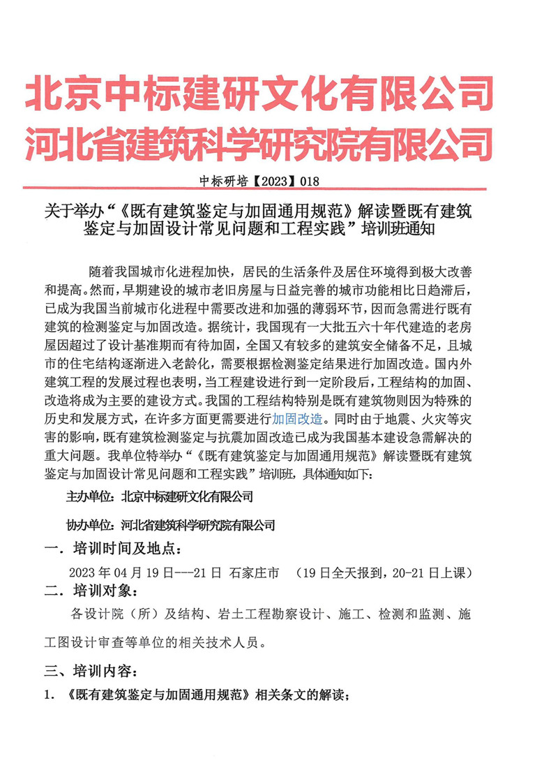 關于舉辦“《既有建筑鑒定與加固通用規(guī)范》解讀暨既有建筑鑒定與加固設計常見問題和工程實踐”培訓班的通知