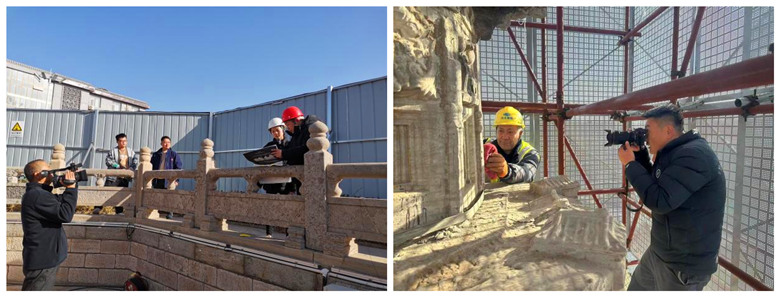 2023年12月8日,趙州陀羅尼經(jīng)幢保護工程施工現(xiàn)場,我公司技術(shù)人員攻堅克難、不畏嚴寒,依然奮斗在施工崗位。在新搭設(shè)的腳手架上,他們牢記文物保護方針,采用科學(xué)、合理的技術(shù)手段對石質(zhì)文物表層結(jié)殼、結(jié)膜污染進行清理,并依照方案核對塔身各類殘損病害,為后期的修繕工作做足準備。