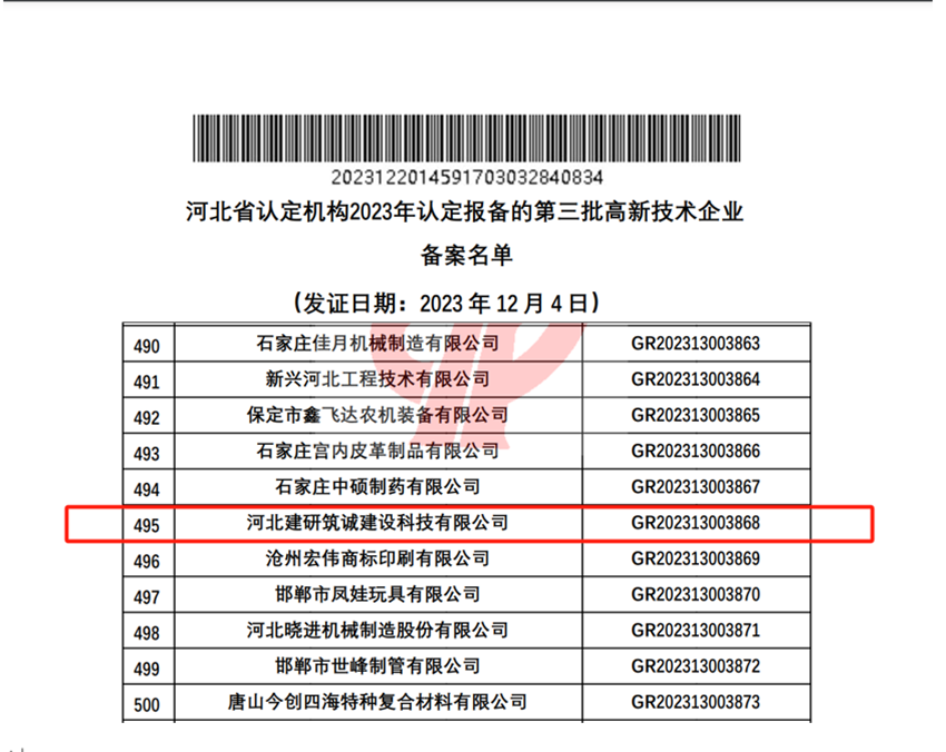 20231220日,全國高新技術(shù)企業(yè)認(rèn)定管理工作領(lǐng)導(dǎo)小組辦公室公示了河北省認(rèn)定機(jī)構(gòu)2023年認(rèn)定報備的第三批高新技術(shù)企業(yè)備案名單,河北建研筑誠建設(shè)科技有限公司順利通過了國家高新技術(shù)企業(yè)認(rèn)定(證書編號GR202313003868),標(biāo)志著公司在科技創(chuàng)新的道路上又邁出了堅實的一步。